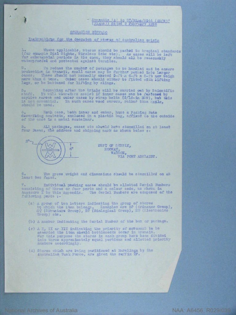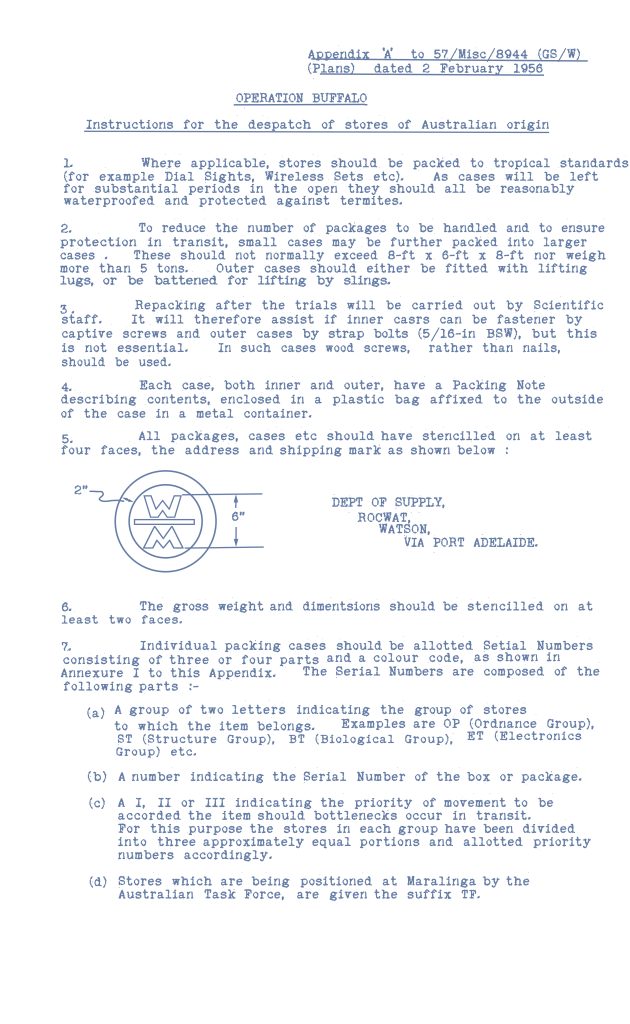 One of the more rewarding restoration projects involved a logistics document titled “Appendix ‘A’ to 57/Misc/8944 (GS/W) (Plans)”, part of the Operation Buffalo archive. This document outlined the packing and shipping instructions for stores of Australian origin destined for the Maralinga nuclear test site in 1956.
